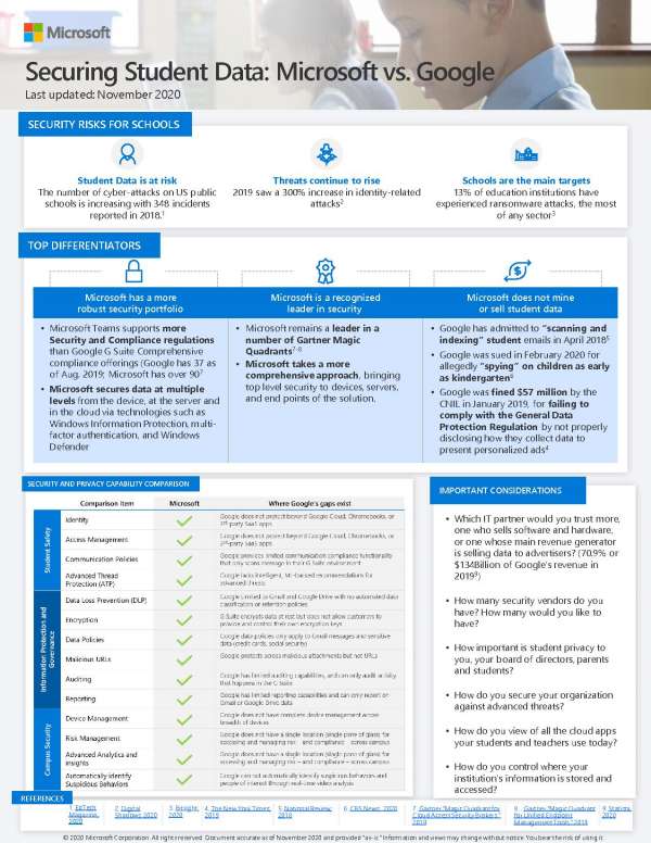 Education institutions have experienced more ransomware attacks than any other sector, and 2019 saw a 300% increase in identity-related attacks. With student data at such high risk, educators need to know what differentiates Microsoft’s security measures compared to Google. Access this one-pager for a comparison of security, privacy and other important considerations.